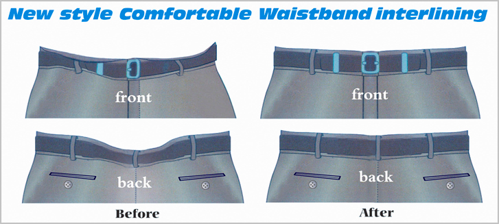2.雙點涂層工藝,粘合溫度低,高粘合度,操作方便,不滲膠,適用于輕薄休閑褲系列。